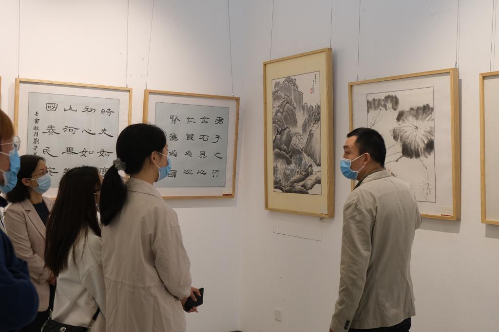 此次展出的書畫作品緊扣主題。書法作品從“清廉如水”到“水以清為貴,人以廉為尊”,從“清風滿懷”到“養浩然正氣,極天地大觀”再到“永葆初心”,無不對新時代清廉學校建設寄予了期冀?!帮L正一帆懸”“砥柱中流”則是歡慶黨的二十大勝利召開。當“愛國”二字方方正正布于宣紙之上,愛國情懷撲面而來。畫作則借梅蘭竹菊、水仙、蓮花等傳達清廉之道。水墨山水畫富有層次感,將“陰中含陽,陽中含陰”的中國優秀傳統哲學融入筆墨之中,充分展現了文化自信。以石榴為題材的水墨畫喻示中華民族團結一家親,鐘南山、袁隆平兩位院士的肖像畫展示了為國為民的高尚精神追求。美術學院學生以校園風光為內容的多幅油畫寫生作品還加上了黨的二十大勝利召開的元素。