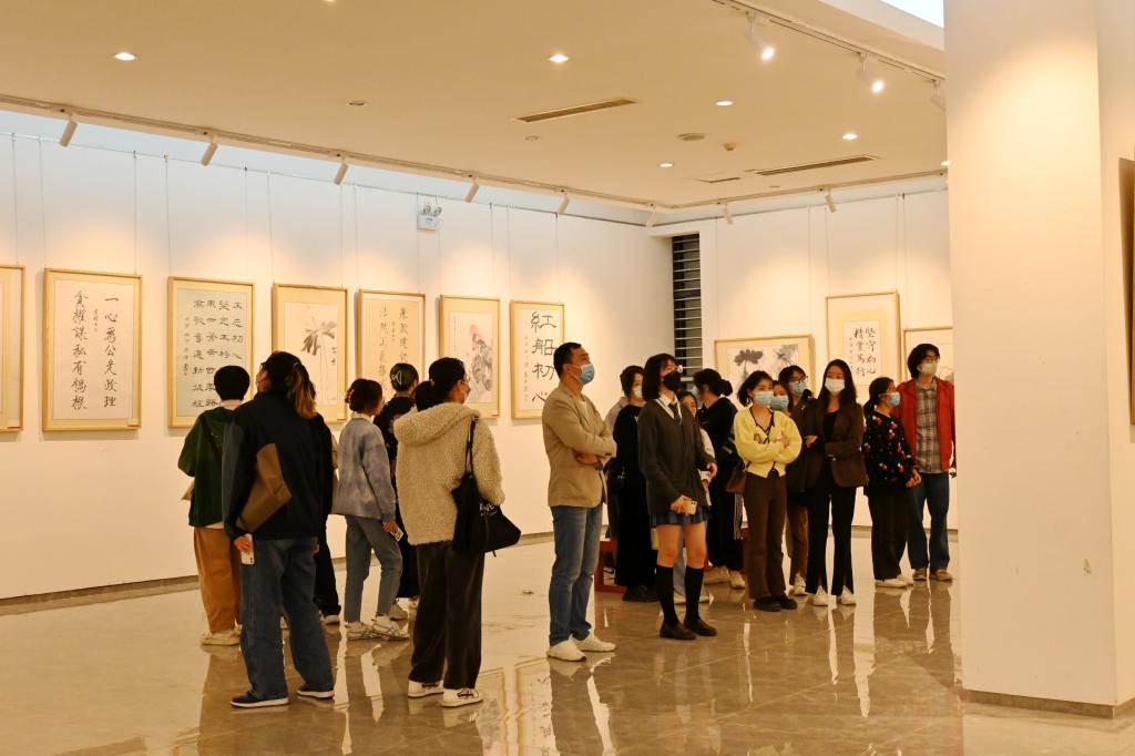 11月3日8時,我校光谷美術館1號展廳一早便迎來了數十名觀展者,學校全體黨委常委和各學院師生代表前來欣賞在此舉行的“學習貫徹黨的二十大精神 建設新時代清廉學?!敝黝}書畫展。