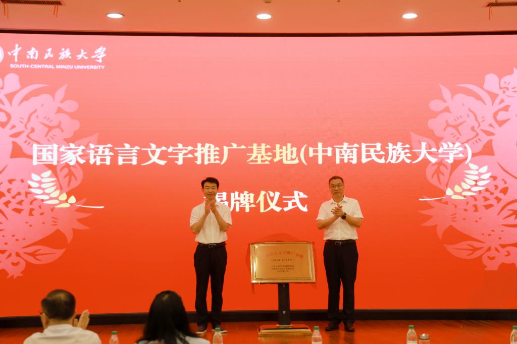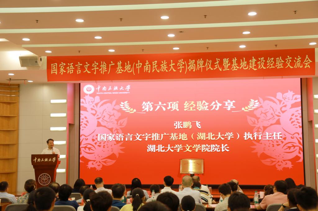 湖北省教育廳語委辦二級(jí)調(diào)研員周建衛(wèi),國家語言文字推廣基地(華中師范大學(xué))負(fù)責(zé)人、語言研究所所長汪國勝,國家語言文字推廣基地(武漢大學(xué))執(zhí)行主任蕭紅,國家語言文字推廣基地(華中科技大學(xué))副主任、人文學(xué)院副院長路成文,國家語言文字推廣基地(湖北大學(xué))執(zhí)行主任、文學(xué)院院長張鵬飛,國家語言文字推廣基地(中南財(cái)經(jīng)政法大學(xué))副主任、教務(wù)部副部長郝新春,湖北第二師范學(xué)院文學(xué)院院長龍珍華,我校黨委副書記、副校長、國家語言文字推廣基地(中南民族大學(xué))主任宋發(fā)軍,校語委成員單位負(fù)責(zé)人、文學(xué)與新聞傳播學(xué)院師生代表共同見證了這一時(shí)刻。文學(xué)與新聞傳播學(xué)院田園子副教授主持本次活動(dòng)。