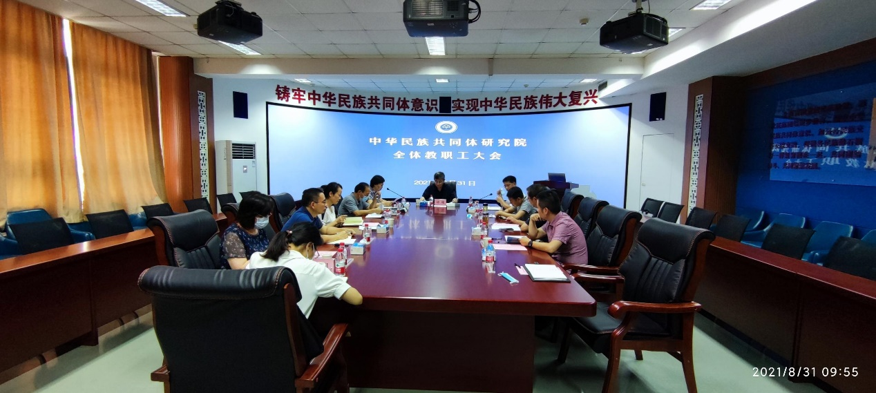 8月31日,中華民族共同體研究院召開全院教職工大會,傳達學習中央民族工作會議精神和國家民委黨組擴大會議精神,對《中華民族共同體概論》課教育教學進行階段性總結,研究加強課程建設。校黨委書記邊境,校黨委常委、組織部長蔡瓊參加會議。會議由研究院院長姚上海主持。