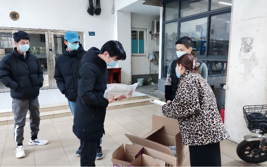 輔導員陳卉丹、柴成龍帶領幾位學生干部,帶著分裝好的物資,來到北區6B和2A的樓下,按照寢室順序請同學們下樓領取考研慰問禮包。