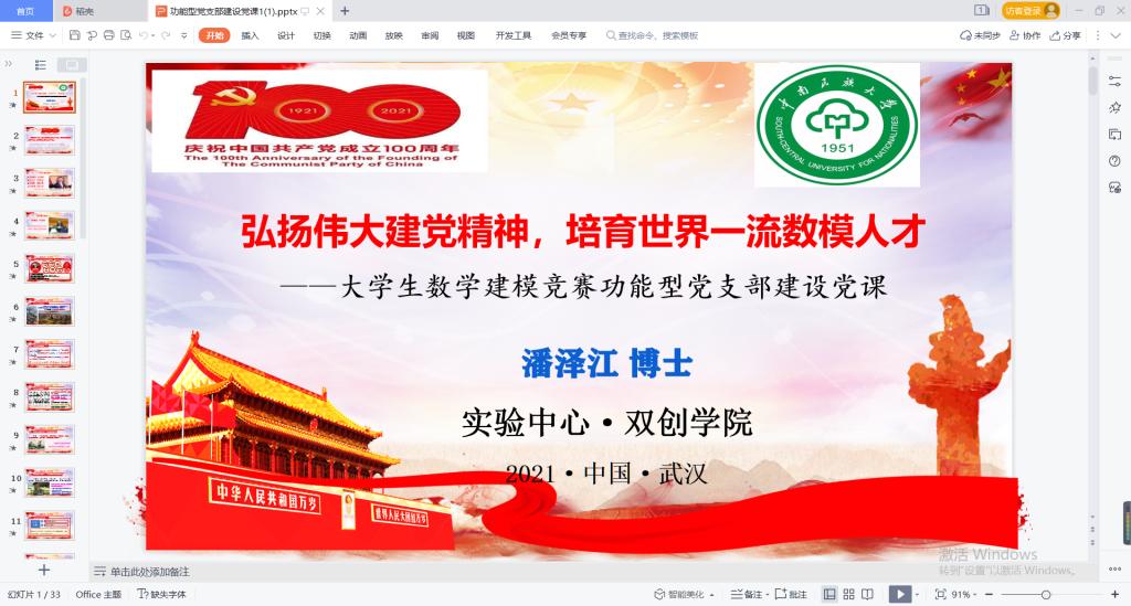 2021年8月24日上午,實驗教學與工程訓練中心主任、創新創業學院院長潘澤江教授,通過騰訊會議,為我校“全國大學生數學建模競賽功能型黨支部”上了一堂別開生面的專題黨課。本次黨課的主題是“弘揚偉大建黨精神 培育世界一流數模人才”,由數學與統計學學院朱忠熏副院長主持,我校2021年全國大學生數學建模競賽暑期培訓班的全體指導老師和參賽學生全程參加。