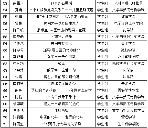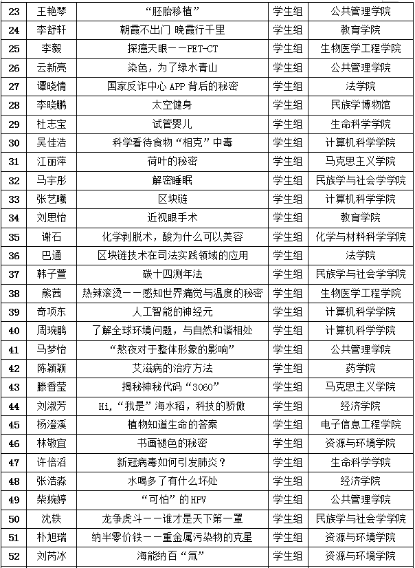 經過各學院、各單位的預選賽,共有71名師生選手成功入圍本次校賽決賽,各路選手同臺競技,各顯神通,從碳中和到機器翻譯,從太空健身到新冠病毒如何引發肺炎,呈現了一場精彩絕倫、妙趣橫生、科學與藝術融合的科普盛宴。
