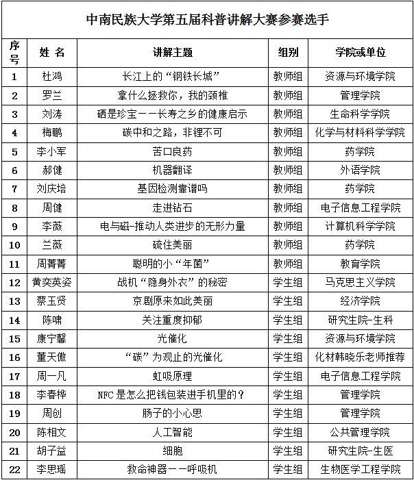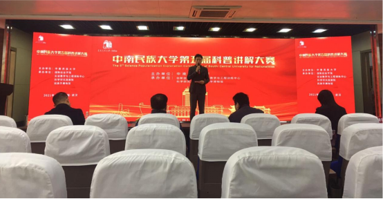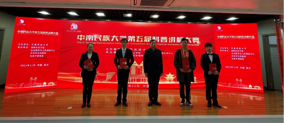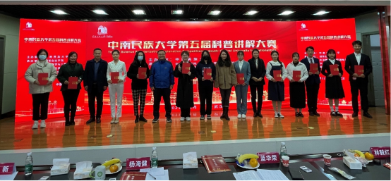 11月27日,第五屆科普講解大賽在16號樓二樓報告廳舉行。中南民族大學黨委常委、副校長杜冬云出席本次大賽,實驗教學與工程訓練中心書記藍華榮、民族學博物館副館長林毅紅、創新創業學院副院長楊海健、科學研究發展院副院長耿新、全國科普講解大賽一等獎獲得者化材學院韓曉樂老師擔任評委。