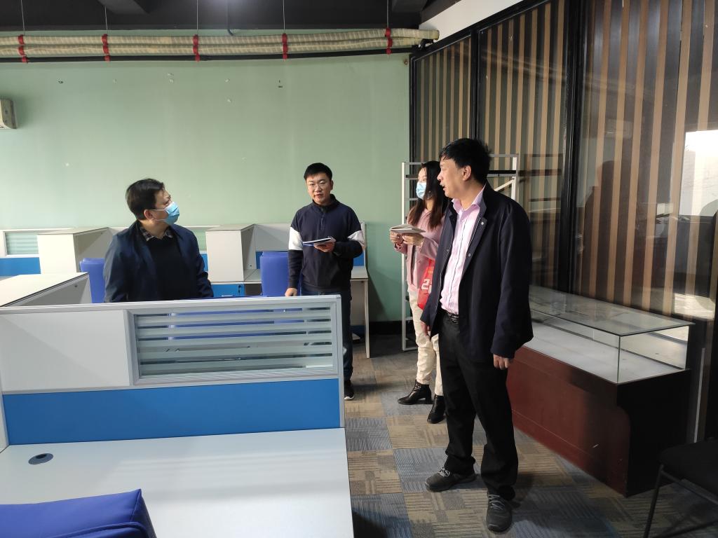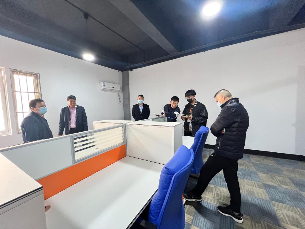 2022年3月10日上午,創新創業學院領導班子藍華榮書記、潘澤江院長、張向明副院長一行來到學校北區科技孵化大樓創業孵化基地,對基本建成的創夢空間文化建設和其他基礎建設檢查指導,進行現場辦公,強調創夢空間要圍繞設計時尚、功能實用、安全第一、人性管理等方面進一步完善建設,并提出了消防監控、臺位電路、創咖服務等具體的完善要求。一起參加檢查的有創新創業學院工作人員及負責建設的公司人員。