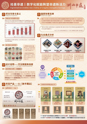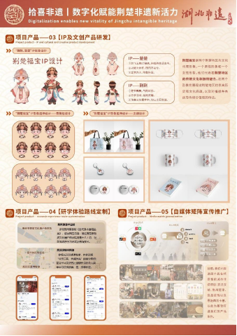 據曾浩同學介紹,為了創作作品《拾喜非遺丨數字化賦能荊楚非遺新活力》,團隊成員利用假期一起前往湖北省各市州進行調研,通過實地走訪、面對面訪談、收集調查問卷等形式,深入了解非遺文化,挖掘文化內涵,獨立開創“一核心+雙主線+三輔助”的運營形式——以非遺數字藏品為核心、充分發揮線上+線下的雙主線模式作用、開發IP文創產品、定制非遺研學體驗活動和構建自媒體矩陣為輔助的賦能模式,積極探索湖北非遺文化振興新路徑,探索荊楚非遺文化傳播新高度。下圖為獲獎作品展示:
