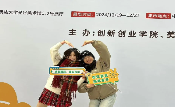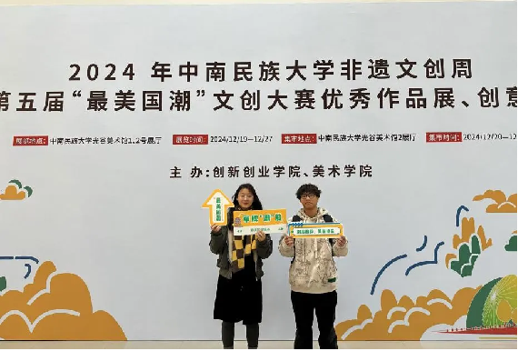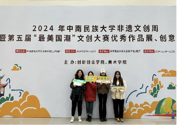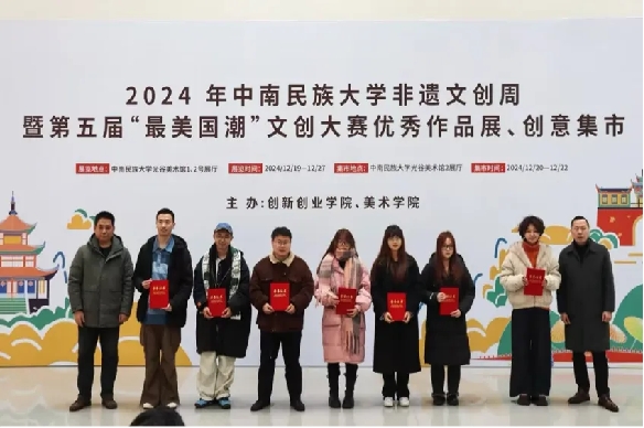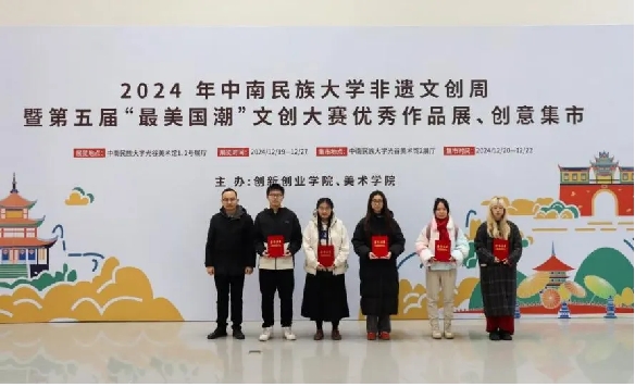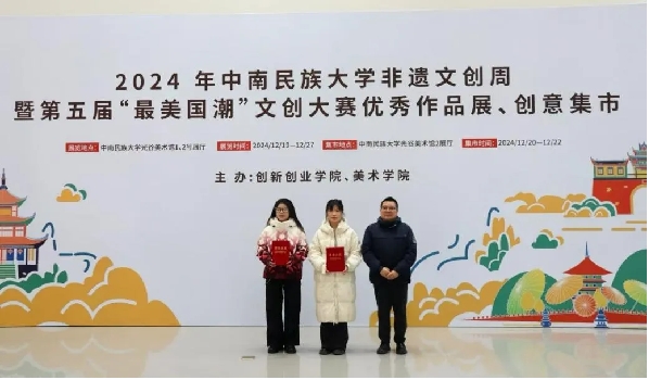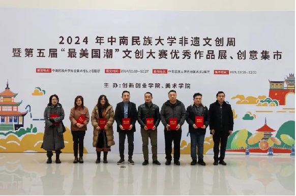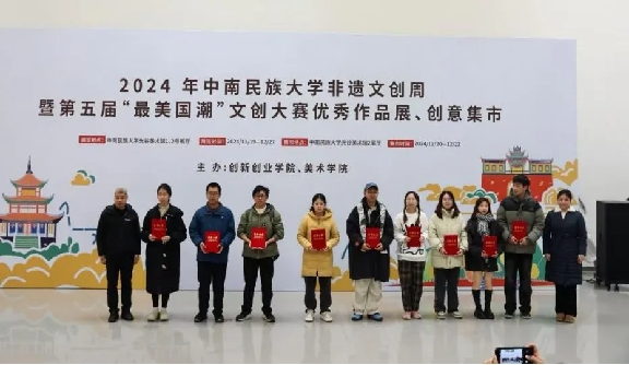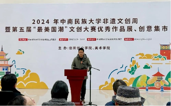 為鑄牢中華民族共同體意識,提升同學們的創新創業能力,2024年12月20日上午,由創新創業學院、美術學院主辦的2024年中南民族大學非遺文創周暨第五屆“最美國潮”文創大賽優秀作品展、創意集市在我校光谷美術館舉行。