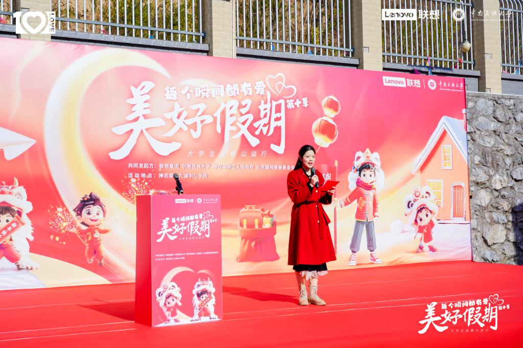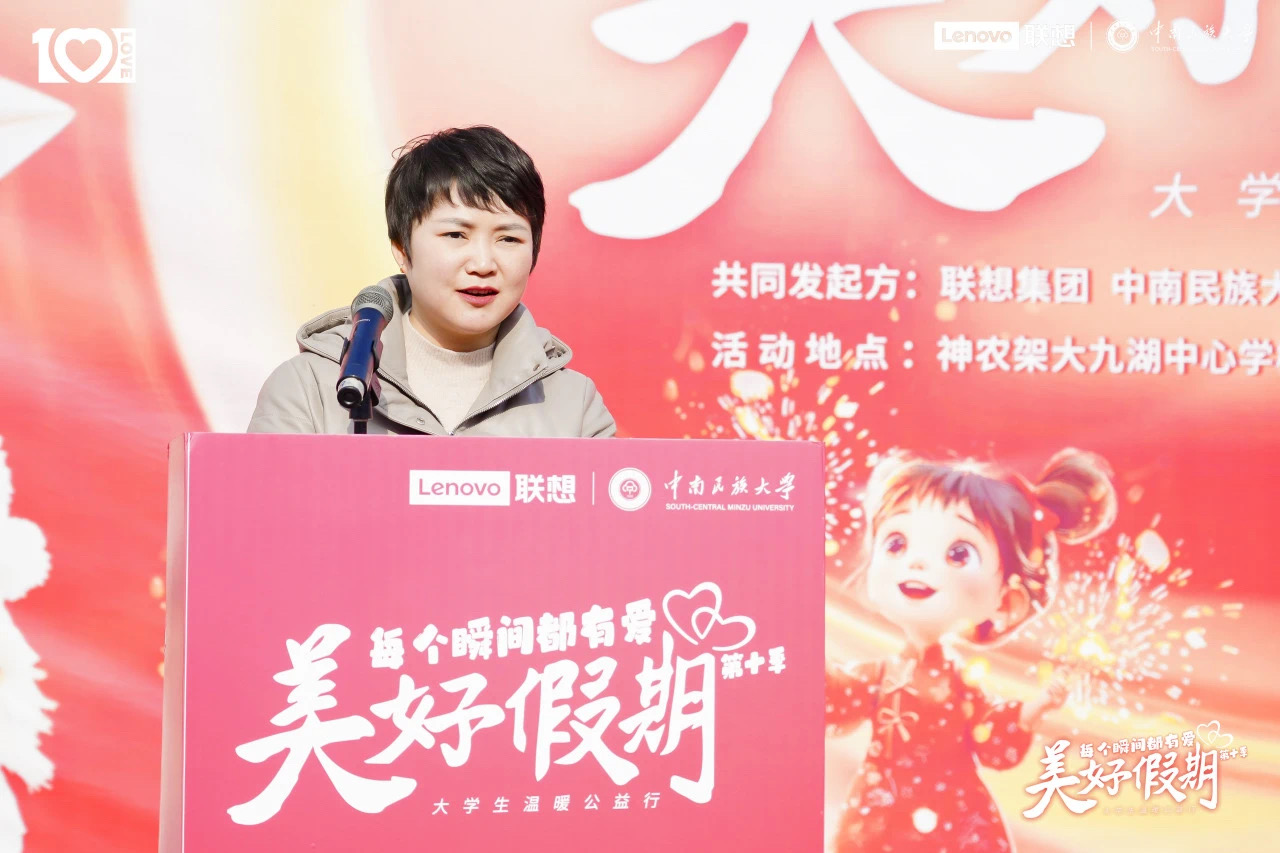 神農架林區大九湖鎮黨委副書記、政府鎮長-盧琳在致辭中介紹了大九湖鎮在生態文明建設、教育發展等方面取得的成就。盧鎮長表示,大九湖鎮作為國家生態文明建設示范鎮、國家衛生鎮、國家園林鎮、全國“平安農機”示范鎮、第一批革命文物保護利用片區分鎮。大九湖鎮政府未來將繼續加強與社會各界的合作,推動當地的教育和文化事業不斷發展,為孩子們創造更好的成長環境。最后,她對聯想集團和中南民族大學對大九湖鎮的支持深表感謝,并表示將繼續推動當地的教育和文化事業的發展。