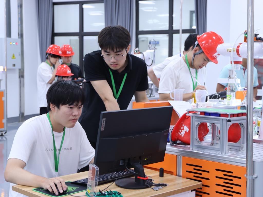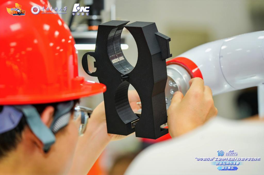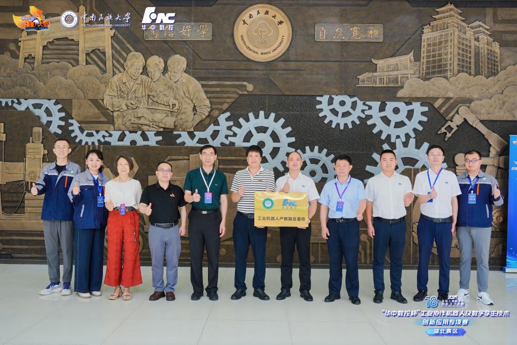 教育部高等學校工科基礎課程教學指導委員會機械基礎課程教學指導分委員會委員、合肥工業大學工程素質教育中心主任(國賽巡視員兼裁判長)田杰,全國3D大賽組委會專家委員會副主任霍有朝,湖北省高教學會金工教學專業委員會主任、華中科技大學工程實踐創新中心主任王書亭,我校黨委常委、副校長李紅燕,武漢華中數控股份有限公司教育事業部總經理周理,以及來自武漢理工大學、湖北大學、武漢科技大學、武漢工程大學、江漢大學等高校的領導、專家和參賽學生出席開幕式。我校創新創業學院院長潘澤江主持開幕式。 李紅燕致歡迎詞。提及學校創新生態時,她說,我校創新創業學院高質量推進“思創、實創、專創、科創、賽創、工創”深度融合,探索構建“育種、育苗、育樹、育果”型石榴籽四級四階段的聯創教育生態。她強調,此次比賽是推進湖北省建成中部地區崛起的重要戰略支點、創響荊楚行動的一項重要舉措。 霍有朝代表大賽組委會指出,本屆賽事以“數智融合,創見未來”為主題,其核心價值在于推動教育、科技、人才一體化協同發展。工業協作機器人與數字孿生技術的融合是制造業升級的關鍵,他呼吁參賽選手注重創新應用與團隊協作,對接行業需求提出具有前瞻性和實用性的解決方案。 現場還舉行了賽事承辦權交接儀式。湖北大學曼城聯合學院副院長高云代表下一屆大賽主辦方接收大賽旗幟。 15日,我校與武漢華中數控股份有限公司共建“工業機器人產教融合基地”掛牌儀式在工程訓練中心舉行。 掛牌儀式現場。 桂星攝 武漢華中數控股份有限公司作為協辦單位,為本次比賽提供技術支持。比賽分賽前夾具創新設計、現場競賽、場外答辯3個環節。現場競賽包括視覺系統調試、數字孿生虛擬仿真調試、液體瓶罐分裝及數字孿生虛實聯調等項目,主要考察和評估選手對工業協作機器人、可編程控制器、機器視覺等設備的應用能力及解決復雜工程問題的能力。