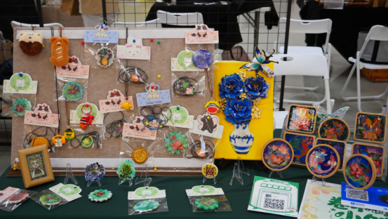 作為一名致力于投身文創設計的在校大學生,美術學院2022級繪畫專業的馮曉陽同學表示,“學校從活動策劃到場館布置做了大量的工作,參展的同學也十分珍惜這次展示自己創業成果的機會,事先都認真做了準備。集市中有許多非常有創意的國潮非遺產品,例如大漆珠子做的手串,螺鈿做的胸針、青花瓷片做的項鏈、纏花做的各種飾品等。來逛集市的同學和老師也非常熱情,對于我們的非遺手工制品接受度很高,給了我們莫大的支持和鼓勵”。