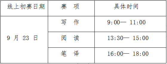 4.比賽形式:線上初賽,線上初賽賽題由主辦單位提供,寫作與筆譯競賽時間為120 分鐘,閱讀競賽時間為90分鐘。所有參賽選手需自備電腦,在賽點指定的考場答題。