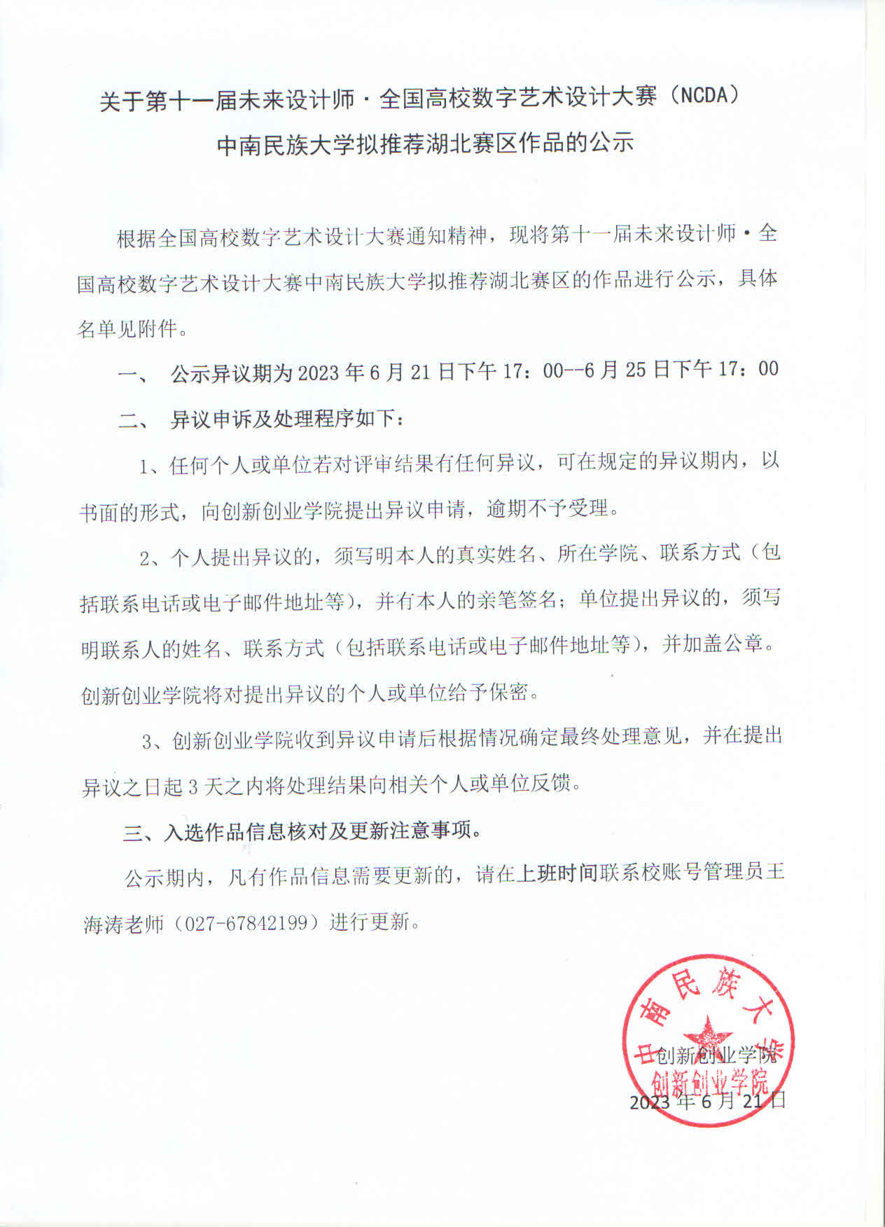 關于第十一屆未來設計師·全國高校數字藝術設計大賽(NCDA) 中南民族大學擬推薦湖北賽區作品的公示