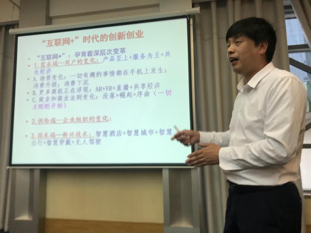 潘澤江教授安排下一步的賽事工作。他強調大賽是“互聯網+”時代的創新創業,所有學科都可以參賽,并介紹了商業計劃書的寫作技巧,分享了幾個實用的模板,代表創新創業學院表態做好大賽的保障、組織與落實工作。