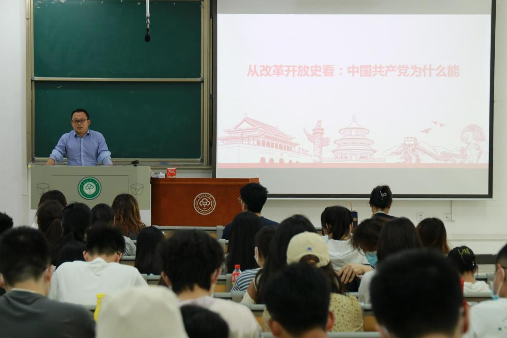 培訓班第四講由經濟學院黨委副書記劉君強主講。他以《從改革開放史看:中國共產黨為什么能》為題,講述了中國共產黨在改革開放中始終堅持為人民服務的宗旨,始終用不斷發展的科學理論武裝自己,始終堅持探索和發展中國特色社會主義道路,始終與人民群眾緊緊聯系在一起,始終不斷自我革命,帶領中國人民一起克服諸多困難,創造了舉世矚目的發展奇跡。同時與學員們一起討論了如何從日常點滴做起,嚴格要求自己,努力踐行共產黨員的先進性,做到思想上、行動上先入黨。