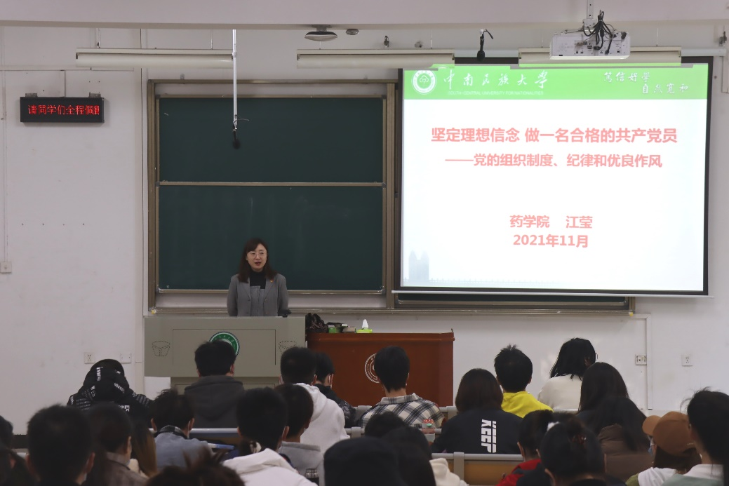 藥學(xué)院黨委書記江瑩以《堅定理想信念 做一名合格的共產(chǎn)黨員——黨的組織制度、紀律和優(yōu)良作風(fēng)》為題展開培訓(xùn)班第一講。她詳細解讀了黨的組織制度,強調(diào)了黨的紀律和作風(fēng),希望學(xué)員們認真學(xué)習(xí)黨的規(guī)章制度,保持理論聯(lián)系現(xiàn)實、密切聯(lián)系群眾、批評與自我批評三大優(yōu)良作風(fēng),在思想認識上成為先鋒,在學(xué)習(xí)實踐中成為標(biāo)兵,在道德修養(yǎng)上成為楷模, 做到學(xué)和用、知和行的統(tǒng)一。