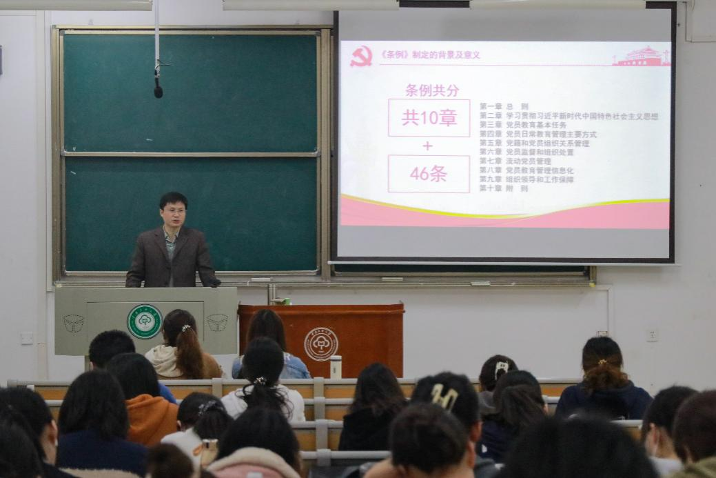 校黨委組織部副部長錢文彬圍繞《中國共產黨黨員教育管理條例》的制定背景、貫徹落實和內容解讀三個方面展開詳細講解。他表示,黨員教育管理是黨的基礎和經常性工作,是新時代黨員教育管理工作的指導方針。他希望學員們通過對管理條例的深入學習了解如何進行自我管理和約束,堅決防范形式主義的泛濫,認真接受黨組織的理論教育,做到“學懂、弄通、做實”,保持思想方面的先進性、純潔性,將黨的理論與學習實踐相結合,努力向黨組織靠攏。