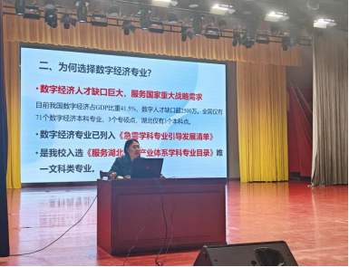 數字經濟教研室劉馳老師以“數字新時代”為切入點,從數字經濟是什么、為什么要學數字經濟、如何學數字經濟三個方面開展專業推介,并通過數字經濟的應用案例,為學生生動詮釋了新時代數字經濟專業的廣闊應用前景。