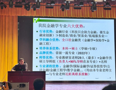 金融學教研室陳全功老師從學院金融學專業悠久發展歷史出發,針對同學們關心的保研、就業兩方面詳細介紹了金融學專業近幾年來取得的豐碩成果,并從行業、學科融合、培養體系、品牌、師資、專業課程分享了本專業的六大優勢。