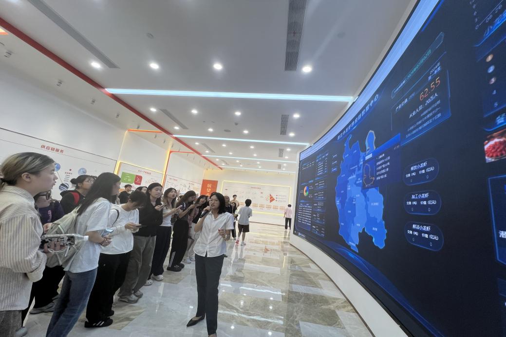 講解員重點介紹了“蝦稻共作”模式,強調了該模式的創新性與優產性;講解了潛江小龍蝦的供應鏈模式、供應鏈體系、供應鏈網絡,同時以數字化的形式向師生們展示了其公共信息、會展貿易、勞務派遣等,展現了數字化與智能化給農產品貿易切實帶來的便利與遞增的經濟效益。