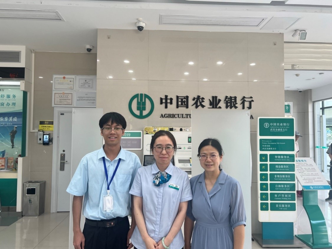 2024 年 7 月至 8 月,在國貿(mào)專業(yè)負(fù)責(zé)人張娟和李建國、曹考老師的帶領(lǐng)下,2021 級國貿(mào)專業(yè)20余名同學(xué)前往中國農(nóng)業(yè)銀行武漢自貿(mào)區(qū)分行各支行實習(xí)。