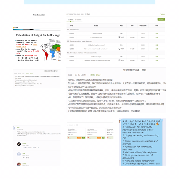 “外貿制單是門實務性很強的課程,要求全面深入地掌握外貿單據知識和繕制技巧,其中報價核算和運費核算等計算比較復雜。”張娟班上的學生表示。為了幫助同學們理解得更加清楚,張娟會在課前發布課前小測讓學生練習,考察學生的掌握情況;課上運用騰訊課堂直播時在討論區板書,并在課件上勾畫重點內容,通過提問學生發言或作業圖片分享等方式,及時發現學生易錯點;課后發布討論或者練習,讓大家對計算中的模糊點進行討論解答,并將重難點錄屏上傳至學習通平臺供學生復習鞏固,查漏補缺。