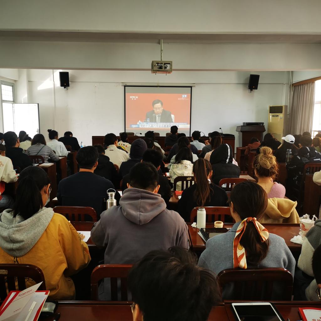 11月12日上午,經濟學院召開黨委理論學習中心組第九次專題學習會議,收看黨的十九屆六中全會精神新聞發布會直播,學院黨委理論學習中心組成員和第11期黨員發展對象培訓班全體學員在1006會議室集中收看,學院各師生黨支部靈活采取線上線下等方式組織其他黨員同志參加學習。