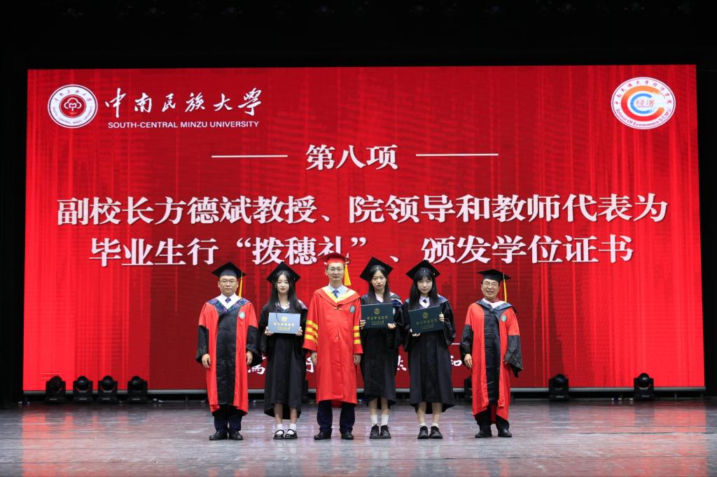 經濟學院副院長熊芳教授宣讀了聘任2024屆畢業生“年級校友理事”“校友聯絡員”的決定,副院長毛中明教授宣讀了學士學位授予決定。隨后,副校長方德斌教授、院領導和教師代表為畢業生們頒發學位證書,并一一正冠撥穗,合影留念。