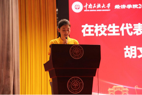 教師代表、二級(jí)教授李忠斌從經(jīng)濟(jì)學(xué)與生活的聯(lián)系出發(fā),勉勵(lì)新生們以“篤學(xué)致知,經(jīng)世濟(jì)民”的理念加強(qiáng)學(xué)習(xí),不斷積累為黨和國(guó)家奮斗的力量;在校生代表胡文迪從日常學(xué)習(xí)生活點(diǎn)滴出發(fā),鼓勵(lì)大家持之以恒的努力,把握好人生方向;研究生新生代表鄧?guó)櫝虨樾律?/span>們分享了在支教階段的經(jīng)驗(yàn),并倡議大家不斷鞏固專業(yè)知識(shí),以批判性的思維提出創(chuàng)造性的研究觀點(diǎn);本科生新生代表鄭良宇表達(dá)了對(duì)未來(lái)學(xué)習(xí)生活的美好期盼,表示將與廣大新生同學(xué)一道攜手并進(jìn),共同進(jìn)步。