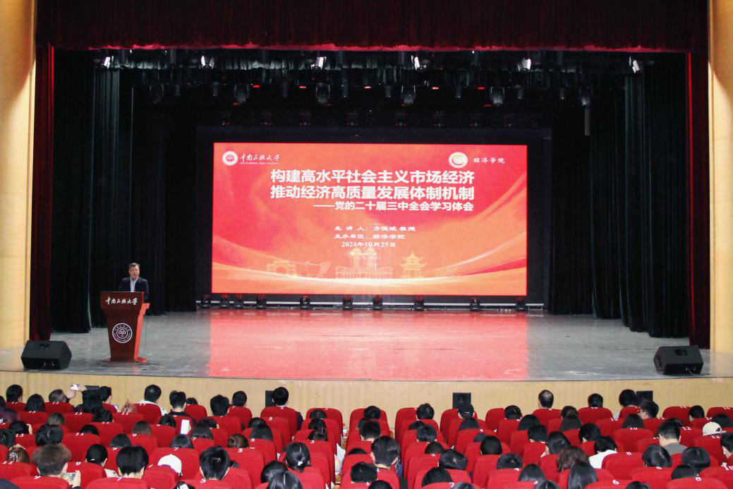 為深入學(xué)習(xí)和貫徹黨的二十屆三中全會精神, 10月25日下午,經(jīng)濟(jì)學(xué)院在大禮堂舉辦專題黨課。校黨委常委、副校長方德斌教授以“構(gòu)建高水平社會主義市場經(jīng)濟(jì),推動經(jīng)濟(jì)高質(zhì)量發(fā)展體制機(jī)制—黨的二十屆三中全會學(xué)習(xí)體會”為題做了輔導(dǎo)報告,教職工代表、本碩學(xué)生代表近700人參加了學(xué)習(xí)。會議由學(xué)院黨委書記戴迎峰主持。
