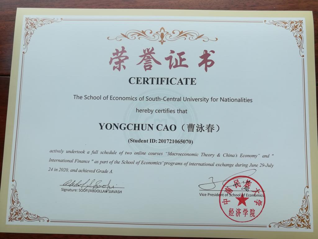 7. 課程結業:課程結束時由經濟學院和授課老師對成績合格者頒發證書,該證書由經濟學院蓋章,Soofi教授簽名。(2020年結業證書見下圖)