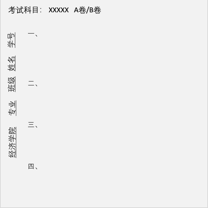 4.考生提前準備4張A4大小空白答題紙和2張A4大小空白草稿紙,除此之外不允許出現書籍和紙張。