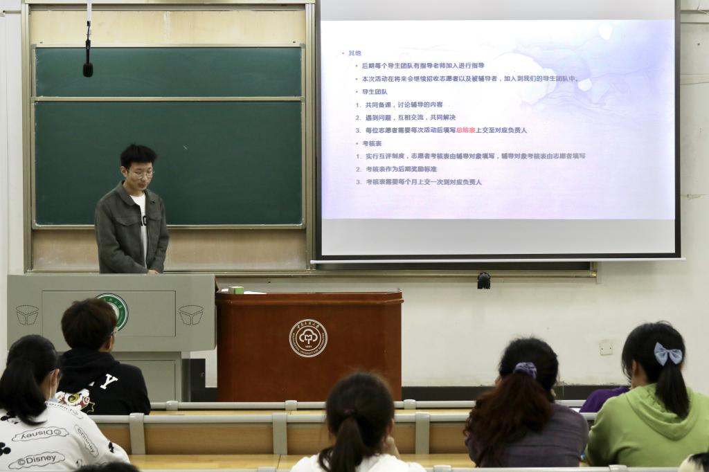 王錦梁從活動(dòng)內(nèi)容、具體分組和獎(jiǎng)勵(lì)標(biāo)準(zhǔn)三方面對(duì)本次活動(dòng)做了詳細(xì)介紹,幫助到場(chǎng)同學(xué)深入了解此次活動(dòng)、領(lǐng)會(huì)活動(dòng)精神。他介紹到,本次學(xué)業(yè)幫扶活動(dòng)將遵循“線下輔導(dǎo)為主,線上輔導(dǎo)為輔”的原則,從四月份開(kāi)始持續(xù)至本學(xué)期期末,以微積分、線性代數(shù)和微觀經(jīng)濟(jì)學(xué)為主要輔導(dǎo)科目。志愿者將被分為6組導(dǎo)生團(tuán)隊(duì),共同制定輔導(dǎo)方案,活動(dòng)采取互評(píng)制度,志愿者和被輔導(dǎo)者互相打分,通過(guò)每月提交互評(píng)表評(píng)選“優(yōu)秀導(dǎo)生團(tuán)隊(duì)”等榮譽(yù),獲得相應(yīng)的綜測(cè)加分和其他獎(jiǎng)勵(lì)。志工部部長(zhǎng)李開(kāi)偉在現(xiàn)場(chǎng)對(duì)同學(xué)們的疑問(wèn)一一進(jìn)行了解答。他講到,本次活動(dòng)旨在組織一批在學(xué)習(xí)上有想法、有經(jīng)驗(yàn)的同學(xué)組成團(tuán)隊(duì),互相交流,互相學(xué)習(xí),帶動(dòng)一批在學(xué)業(yè)上遇到困難的同學(xué)解決問(wèn)題,在同學(xué)之間搭起溝通互助的橋梁,為學(xué)有余力的同學(xué)提供幫助他人、獲益自己的機(jī)會(huì),為被輔導(dǎo)的同學(xué)提供修補(bǔ)知識(shí)漏洞、完善知識(shí)體系、提升自我能力的渠道。