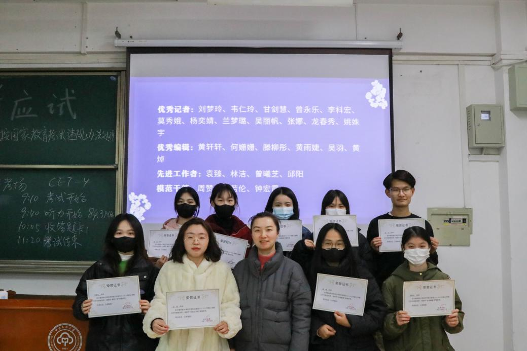 徐瑩在發言中對記者團的工作開展情況給予了充分肯定,并對團隊的未來發展方向提出三點期望:一是發揚團結向上的團隊精神與認真負責的工作作風,加強各部門協作配合,不斷提高新聞報道質量;二是在實踐中珍惜學習鍛煉的機會,充分利用學院提供的優勢資源,多學、多寫、多思考;三是繼續豐富和拓展團隊建設形式,利用業余時間開展讀書分享會、優秀新聞報道學習等活動,使成員們學有所得。會議最后公布了記者團本學期評優評先名單,徐瑩老師為優秀記者和先進個人頒發了獲獎證書。
