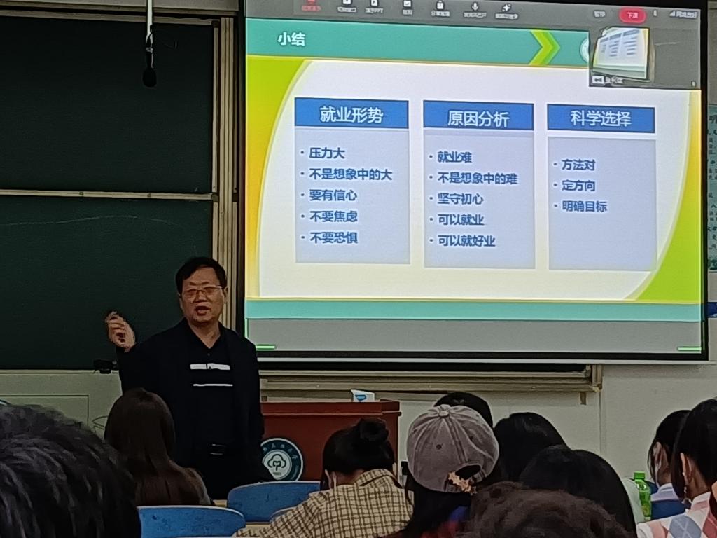 李春雷老師從近年全國、中南民族大學和經濟學院就業形勢出發,圍繞“實現好就業”這個目標,運用詳實數據,向學生分析了影響就業的多種因素,識別了各種就業風險。例如新冠疫情、中美貿易摩擦、烏克蘭危機導致的經濟下行壓力增大、勞動力供需結構不平衡、畢業生規模逐年增加帶來的不確定性等外部客觀風險,以及畢業生實習實踐經歷缺乏、就業期望值高、動手和實操能力不夠帶來的不確定性等內部主觀風險,并給出了風險控制策略。希望同學們轉變就業觀念,降低就業期望值,先生存后發展,在掌握專業知識的同時注重培養個人能力等。最后,李老師提出了早定位、早抉擇、早準備等建議,指導大家做出科學理性選擇。