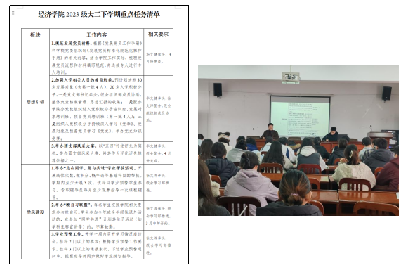 2月24日下午,2023級開展新學期學生干部工作會議,2023級輔導員華文健、徐文洋,各班班長、團支部書記參加會議。會上,華老師與徐老師就近期重點工作予以布置安排,同時針對大二下學期的全期工作進行了預布置及預動員;并強調(diào)學生干部要認真學習重點工作要求,迅速調(diào)整狀態(tài),踐行責任擔當,認真落實學院“黨建+學生工作”實施辦法,積極為年級師生、為班級同學排憂解難,發(fā)揮骨干模范帶頭作用。