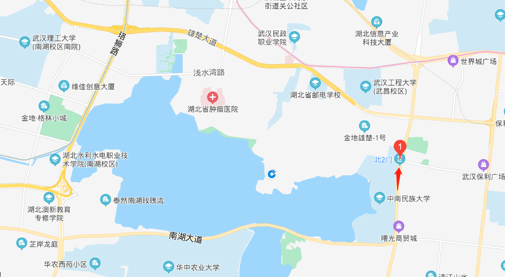 乘公交362路、362路、538路、567路內環、567路外環、572路、583路、586路、590路、732路、739路、758路、759路、810路、811路、902路、YX362路至民族大道中南民族大學下車即可(乘車須由北二門進入)。