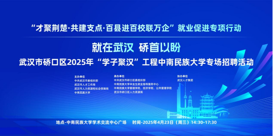深入推進“學子聚漢”工程,圍繞轄區產業特點和企業人才需求,聚焦高校專業優勢,針對性地開展“就在武漢 硚首以盼”系列校園招聘活動,為硚口建設“人才強區”提供強大創新動力和堅強人才保障。武漢市硚口區將于4月23日在中南民族大學舉辦“就在武漢·硚首以盼”暨“才聚荊楚·共建支點·百縣進百校聯萬企”就業促進專項行動,武漢市硚口區2025年“學子聚漢”工程中南民族大學專場招聘活動,屆時有大量高薪優崗,誠邀全市高校畢業生前來參會。
