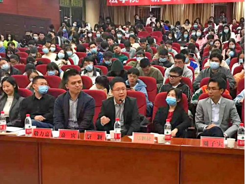 2021年10月23日18點30分,應中南民族大學法學院邀,北京大學法學院副院長、教育部長江學者、第九屆全國十大杰出青年法學家車浩教授擔任“法霽講壇”第43期主講嘉賓,在模擬法庭為我院近300名師生發表了題為《法律思維與法學方法》的演講(如圖一)。