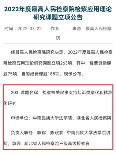 7月22日,最高人民檢察院官網發布了2022年度最高人民檢察院檢察應用理論研究課題立項公告。我院陳歡歡老師與湖北省人民檢察院三級高級檢察官袁園合作主持的課題“檢察機關民事支持起訴類型化和精準化研究”獲得立項。