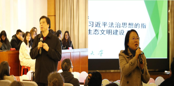 “初露鋒芒”環節,每組選手需要在規定時間內作答,大家從容不迫,發揮集體智慧,最終2101班、2103班、2104班、2106班、2108班代表隊晉級下一輪。“突出重圍”環節,選手們輪流回答主持人的提問,大家斗志昂揚,反應迅速,場下觀眾喝彩連連,現場氣氛迅速升溫。根據兩輪比賽的累計得分,2101班、2106班、2108班代表隊進入最終決賽。決賽環節,比分交替上升,“火藥味”十足。最終,2101班代表隊摘得桂冠。比賽中,鄭鵬程老師和廖華老師還分別就如何使用習近平法治思想引領部門法的學習和習近平法治思想指導生態文明建設等與同學們做了簡要交流。