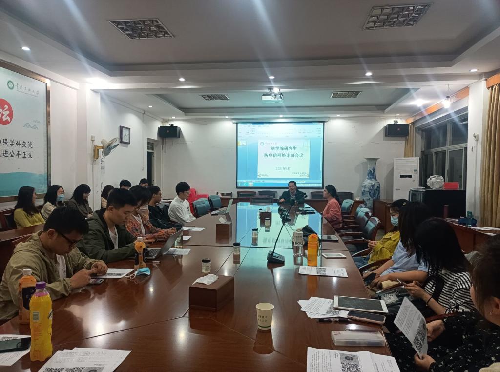2021年4月23日19點,法學院研究生防電信網絡詐騙會議在我院219會議室召開。本次會議由我院研究生輔導員郭秀芳老師主持,院黨委書記祁帆出席會議,法學院全體在校研究生參會。