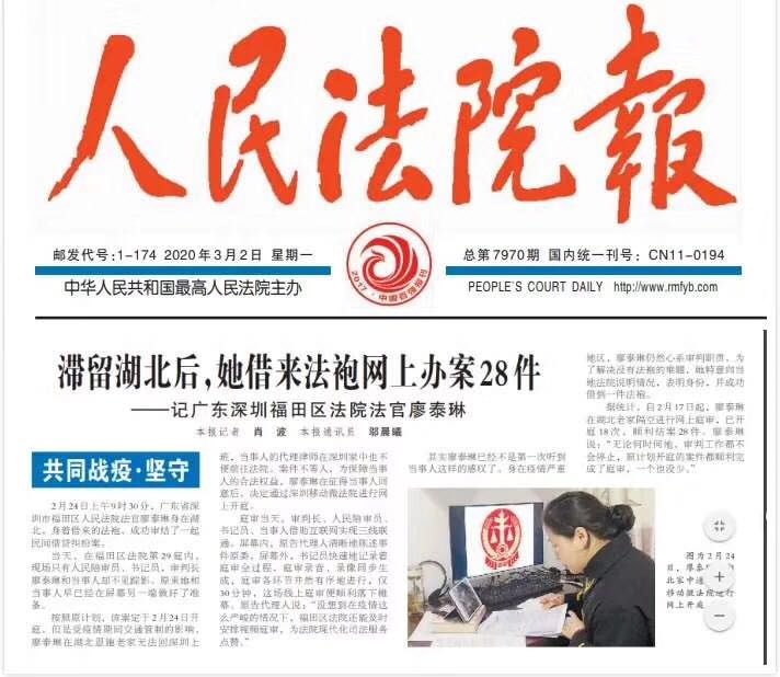 我院2000級校友深圳市福田區人民法院法官廖泰琳疫情期間網上開庭辦案獲好評