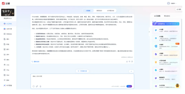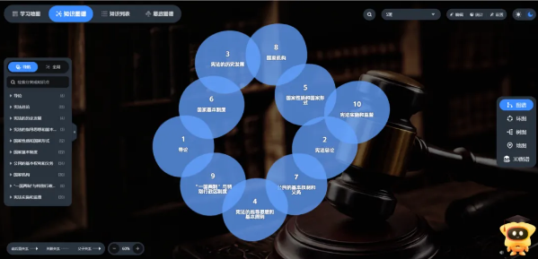 憲法作為國家根本大法,其教育需兼顧理論深度與實踐溫度。朱春華副教授團隊打造的《憲法學》智慧課程,以“知識圖譜體系化、思政育人精準化、AI 助教智能化”為特色,構建起“三維坐標系”學習生態。