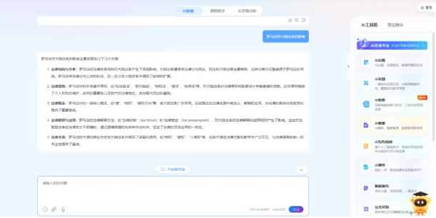 2.AI助教:24小時化身法律史學向導,解答“羅馬法對大陸法系的影響”等問題,結合歷史場景與現代案例提供多維解析,并推送關聯學術資源,激發思辨能力。