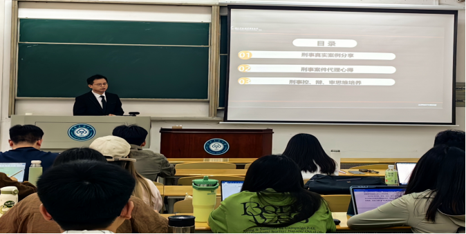 本次專題課程主要從刑事真實案例分享、刑事案件代理心得、刑事控、辯、審思維的培養三方面展開。余飛律師熱情地向同學們分享了他在實務中遇到的兩個典型案例,結合具體案例深入淺出地剖析了案件中的關鍵節點及解決策略。他強調,在刑事案件的代理過程中,律師不僅要精通法律知識,更要具備分析、解決問題的能力和堅持不懈、不斷嘗試的精神和決心。