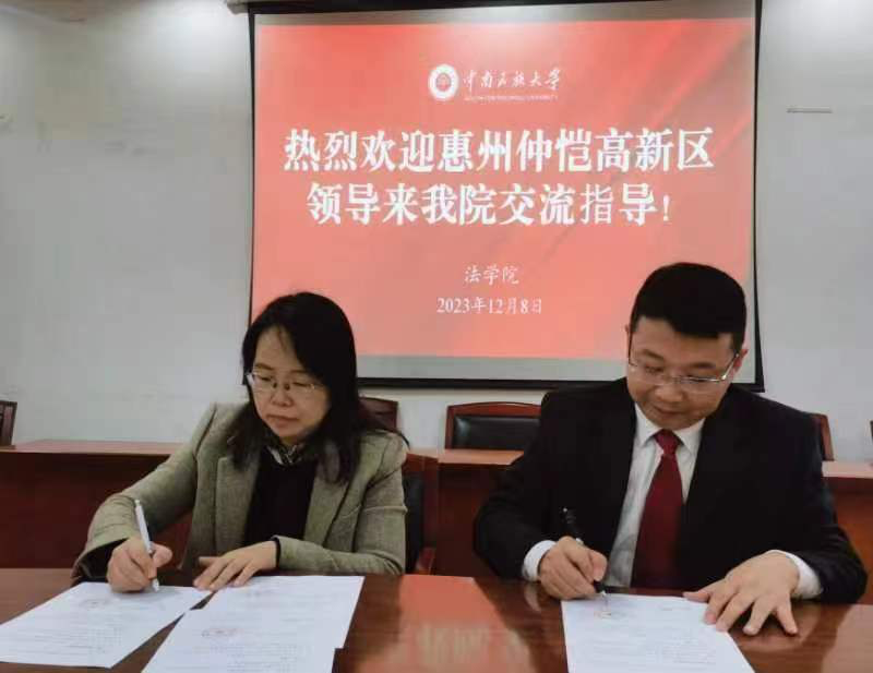 座談會中,惠州仲愷高新區法院與我院代表簽訂教學實習協議并舉辦實踐教學基地授牌儀式。楊軍榮副書記首先向我院領導表示衷心感謝,隨后介紹惠州仲愷高新區及高新區人民法院相關情況,他指出希望仲愷高新區人民法院和我院能夠以此次簽約儀式為起點,深化院校合作交流,在多方面開展合作共建,力爭取得豐碩成果。
