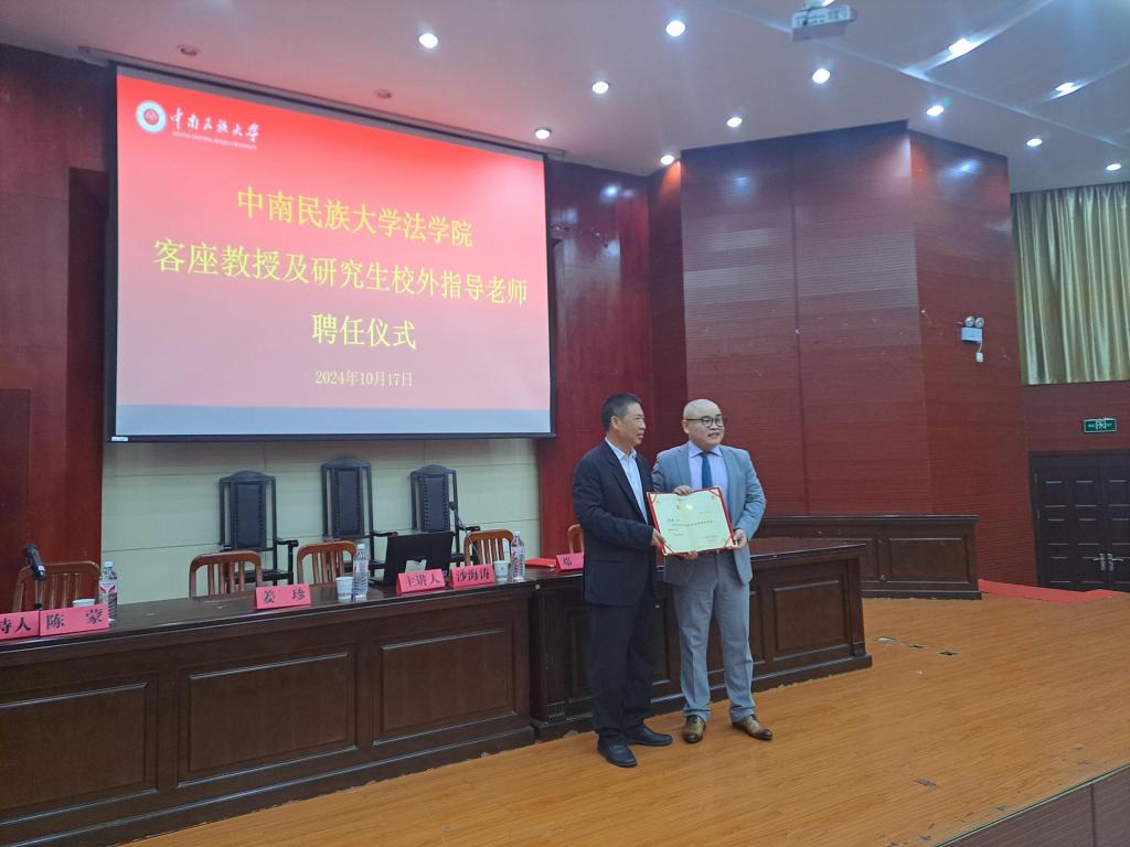 講座開始前,學院舉行隆重的聘任儀式,學院黨委書記鄧行為沙海濤博士頒發(fā)聘書,聘任沙海濤律師為學院客座教授和研究生校外指導老師。