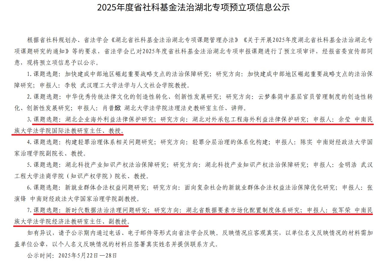 近日,湖北省社科規劃辦、省法學會發布了2025年度省社科基金法治湖北專項預立項信息公示,我院余瑩教授申報的課題《湖北企業海外利益法律保護研究》、張軍榮副教授申報的課題《新時代數據法治法理問題研究》獲批立項。