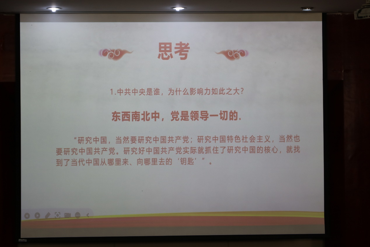 課程伊始,陶恒老師以近期股市暴漲為切入點,突出反映了中國共產黨引領國家經濟發展的強勁動力,體現了中國共產黨把握經濟發展大局、引領市場方向上的高瞻遠矚。隨后,他對一系列具體事例進行分析,強調我國的大政方針都與黨同呼吸共命運,突出了黨的重要性,并指出我們應當堅決擁護黨的領導,為實現中華民族偉大復興的中國夢而努力奮斗。