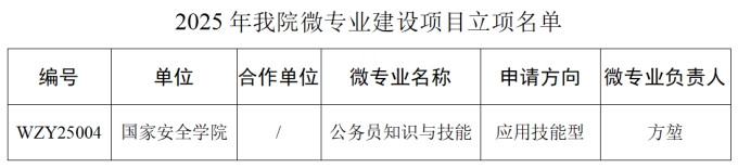 近日,我校2025年微專業建設項目評審結果正式公布,由國家安全學院申報的“公務員知識與技能”微專業成功獲批立項,成為學校本年度重點建設的4個微專業之一。